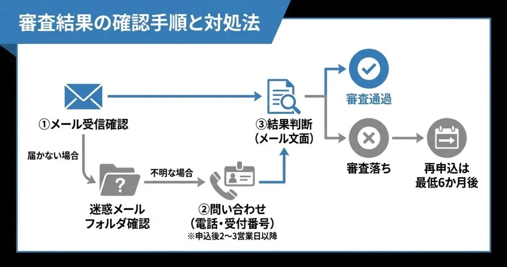 このセクションでは、審査結果が届かないときの確認方法、問い合わせ先、審査結果メールの読み方を解説します。確認方法を知っておくことで、不要な再申し込みや審査への悪影響を防ぐことができます。
