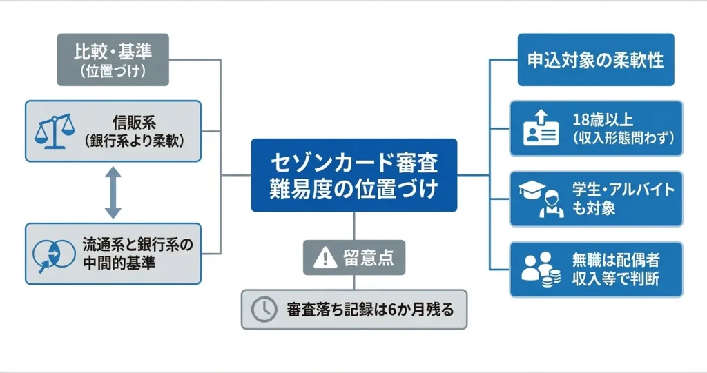 セゾンカードの審査難易度は、クレジットカード業界全体の中では標準的な水準と考えられています。銀行系カードと比較すると申し込みやすく、消費者金融系カードと比較すると一定の基準が設けられている流通系・信販系の位置づけです。