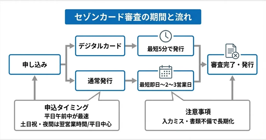 セゾンカードの審査は、最短で即日、通常は申込日を含めて2〜3営業日程度で完了するケースが多く見られます。