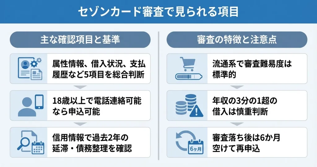 審査の仕組みを理解することで、自分が通過できる可能性や準備すべきことが明確になります。ここでは、審査で実際にチェックされる項目と、セゾンカードの審査難易度の位置づけを解説します。